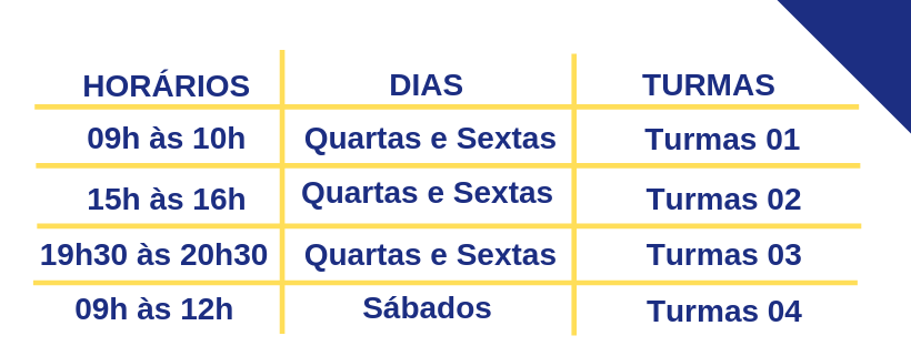 As aulas dessa modalidade acontecerão nos seguintes horários: