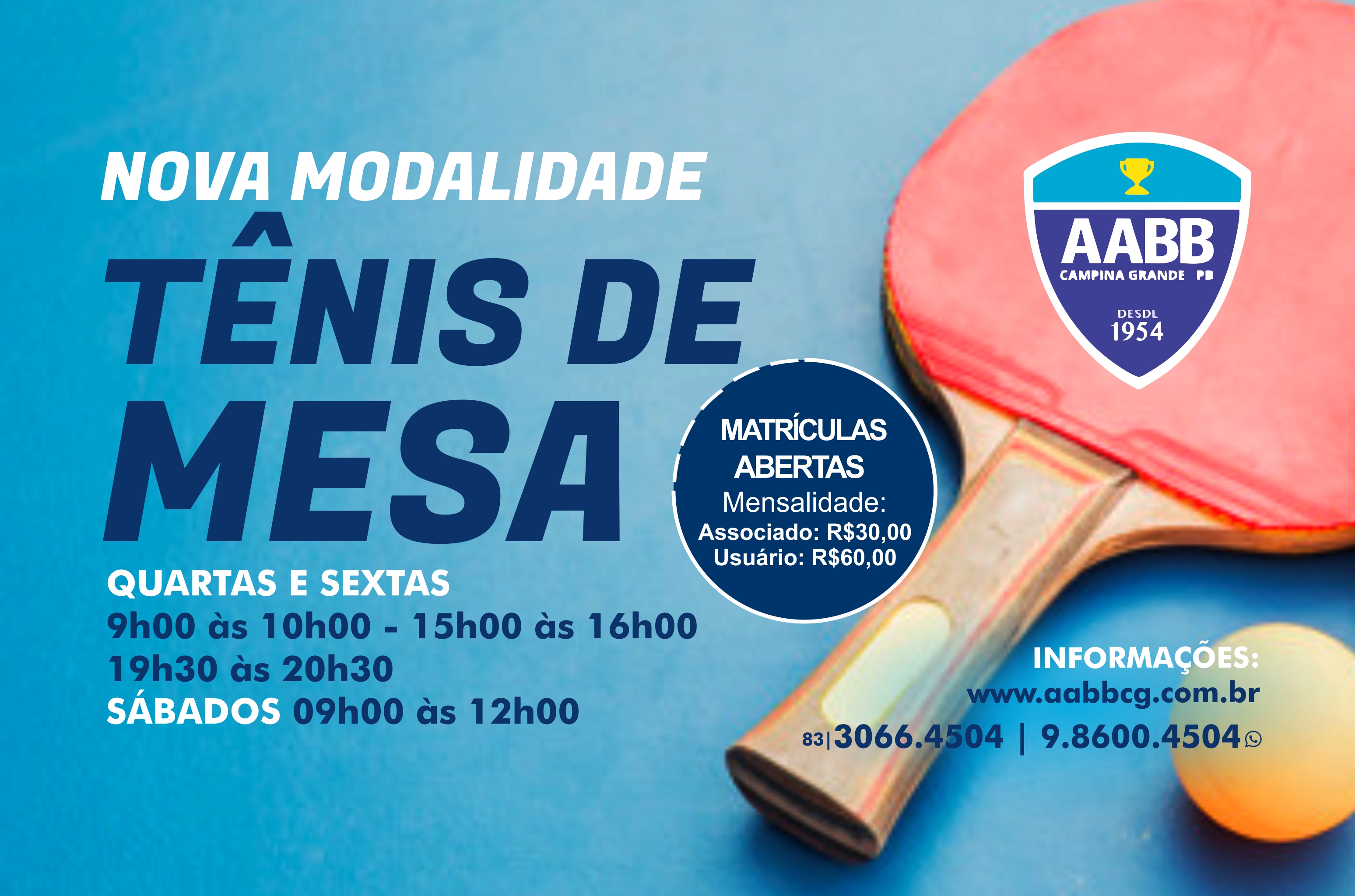 A diretoria da AABB Campina Grande juntamente com a coordenação de esportes, abriu neste mês de outubro/2019 as inscrições para a nova modalidade esportiva do clube: o tênis de mesa.