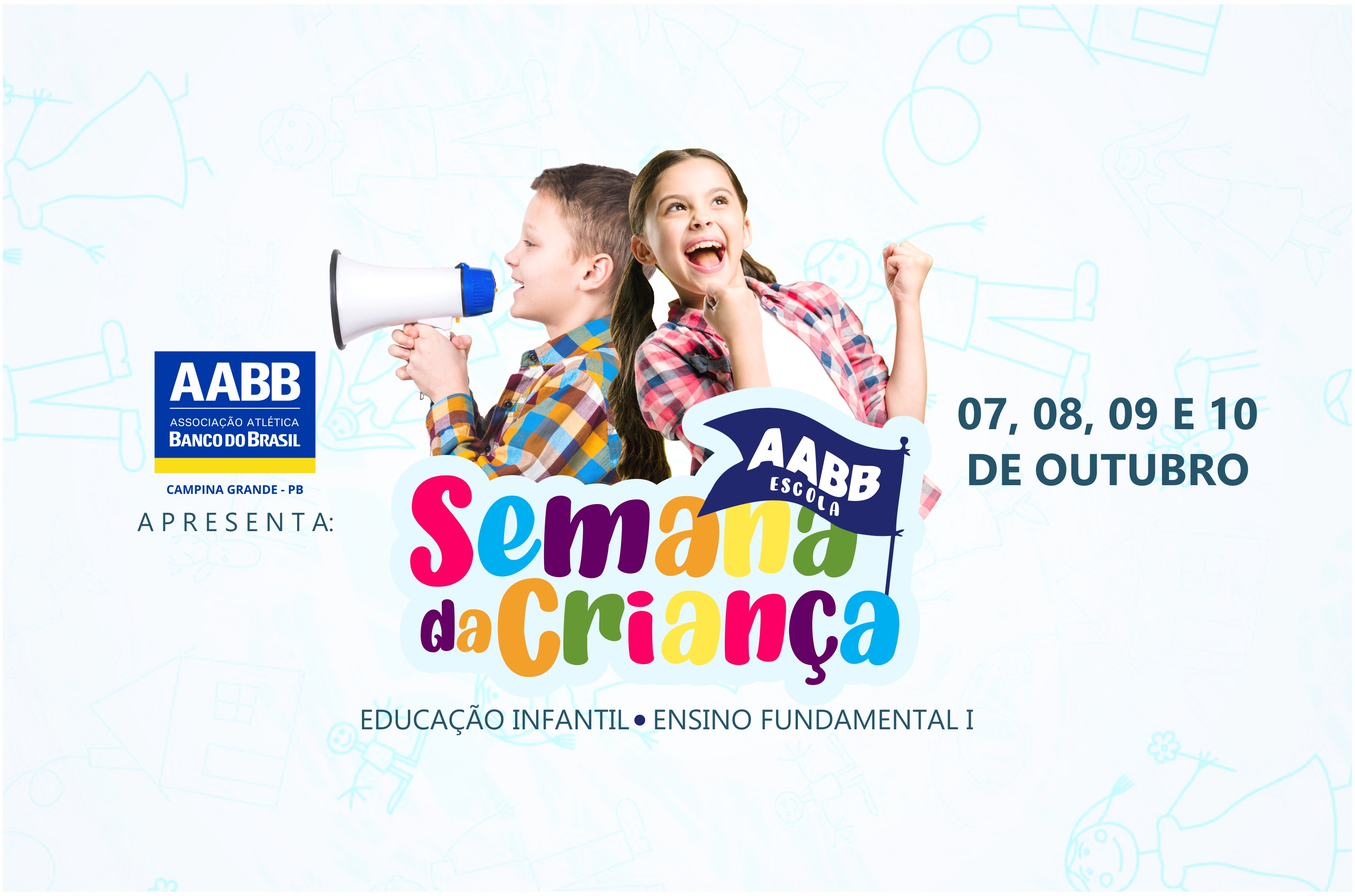 A diretoria da AABB Campina Grande está promovendo o projeto “Semana da Criança AABB”, que acontece entre os dias 07 e 10 de outubro/2019. O mesmo visa promover momento de lazer e diversão para crianças e adolescentes, das escolas da cidade.