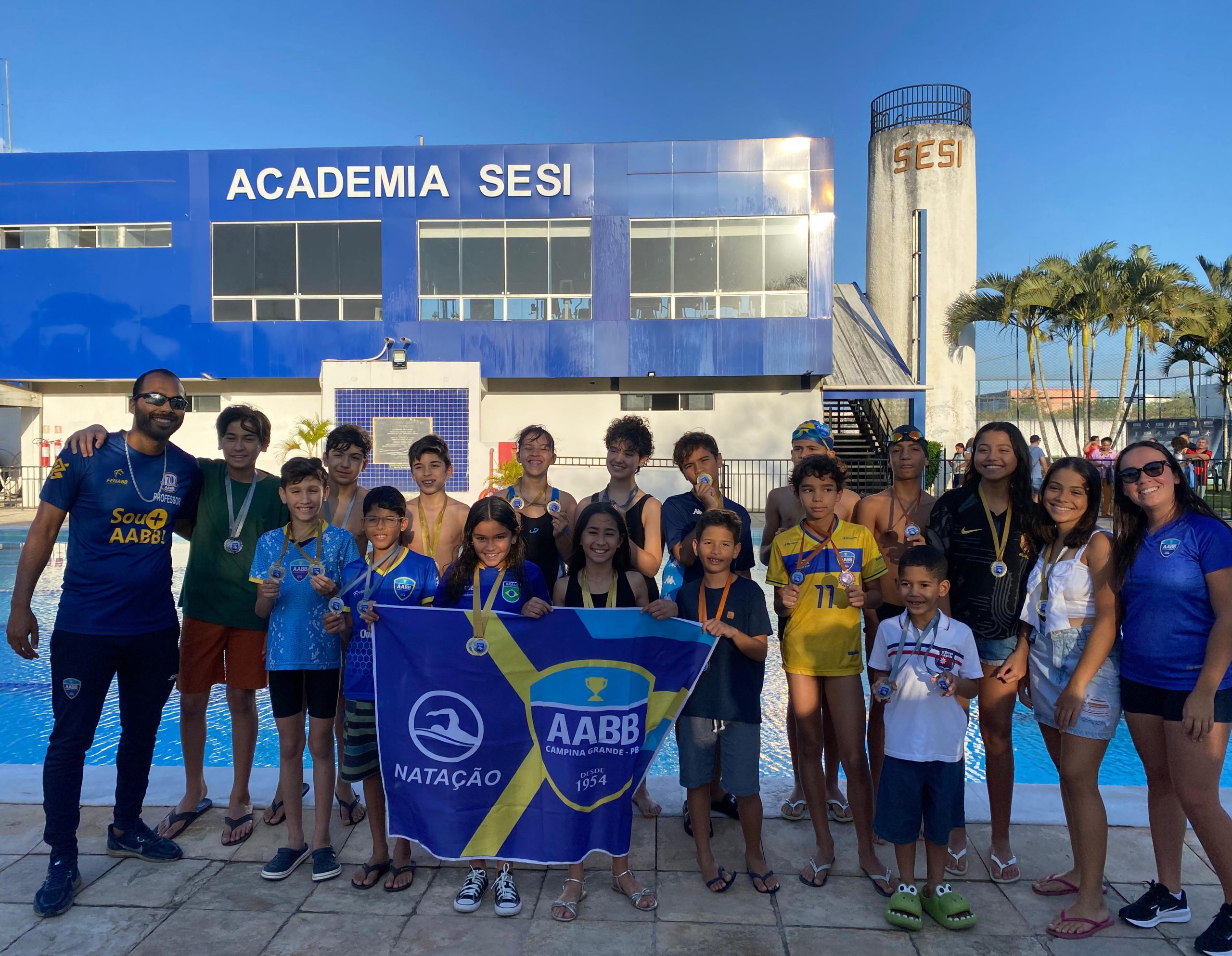 No último sábado, dia 26, a equipe de natação da AABB participou do Festival de Natação de Não-Federados, Etapa Crawl/Borboleta, realizado no Sesi Distrito, em Campina Grande. Com um total de 17 atletas competindo, a equipe se destacou e trouxe para casa um impressionante resultado: 16 medalhas de ouro, 12 de prata e 6 de bronze.